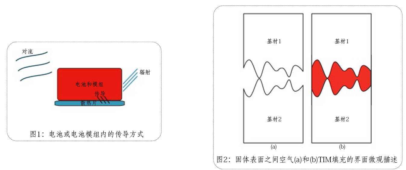 表面粗糙導致只有小部分的表觀表面彼此直接接觸,從而包含了空氣。為了解決該問題,如圖2(b)所示,使用TIMs 材料連接界面,取代空氣,從而可以更好的填充微觀上粗糙的界面。同樣重要的是,TIMs 可以提供良好的電絕緣性能,以防止在高能量電池和常用的金屬散熱器之間發(fā)生高壓擊穿。
