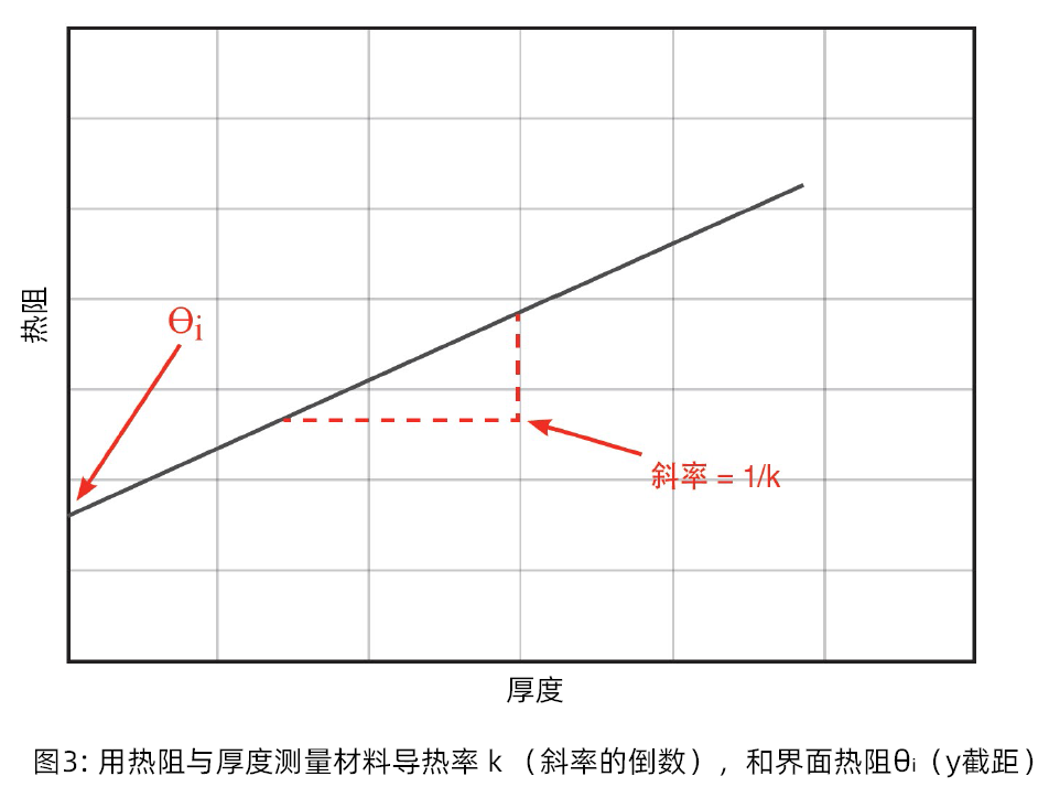 式中:θ是熱界面材料膠層的熱阻:θi ,是熱界面材料膠層頂界面和底界面的界面阻抗;t是熱界面材料膠層厚度;k 是熱界面材料的導熱率。實際上,熱界面材料的熱阻是通過測量給定穩(wěn)態(tài)熱通量時的ΔT來確定。如圖3 所示,導熱率和界面阻抗可以通過測量一系列TIM膠層厚度的熱阻來確定。如前所述,這些單獨的參數(shù)在評估熱傳遞在離散界面上以及通過TIM本身的體積方面是特別重要的。例如:一種高導熱率的熱界面材料在較薄的粘接厚度時,仍會具有較高的熱阻。這往往是因為TIM材料與一個或兩個基材的物理接觸不良,因而得到較高的界面熱阻θi 所導致。正是由于這些原因,才需要比較導熱填縫材料和導熱墊片的熱阻性能。