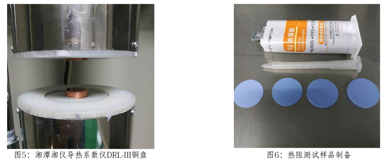 (2) 依照ASTM D5470 測試標準,使用湘潭湘儀導熱系數(shù)儀DRL- Ⅲ(以下簡稱湘潭導熱儀)進行這次的熱阻測試對比。因為銅對金屬-TIM-金屬測量具有非常小的熱阻貢獻,銅盤的熱阻(圖5)可以在此次測試分析中忽略不計。