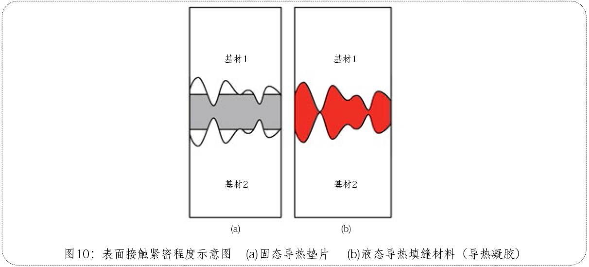 湘潭導熱儀是把界面熱阻跟導熱材料的本身的熱阻當成一個整體去計算的,這種計算方式更偏向于實際應用的使用情況。而導熱墊片的接觸熱阻相較于導熱填縫材料高的多,所以實際使用的導熱計算結果會差異很大。那么隨著厚度的增加,導熱墊片本身的熱阻也越來越大,界面熱阻θi所占總熱阻θ的比例越來越小,所測得的導熱值也越來越接近實際值。圖10示意兩種不同狀態(tài)的導熱材料和表面的接觸狀況。