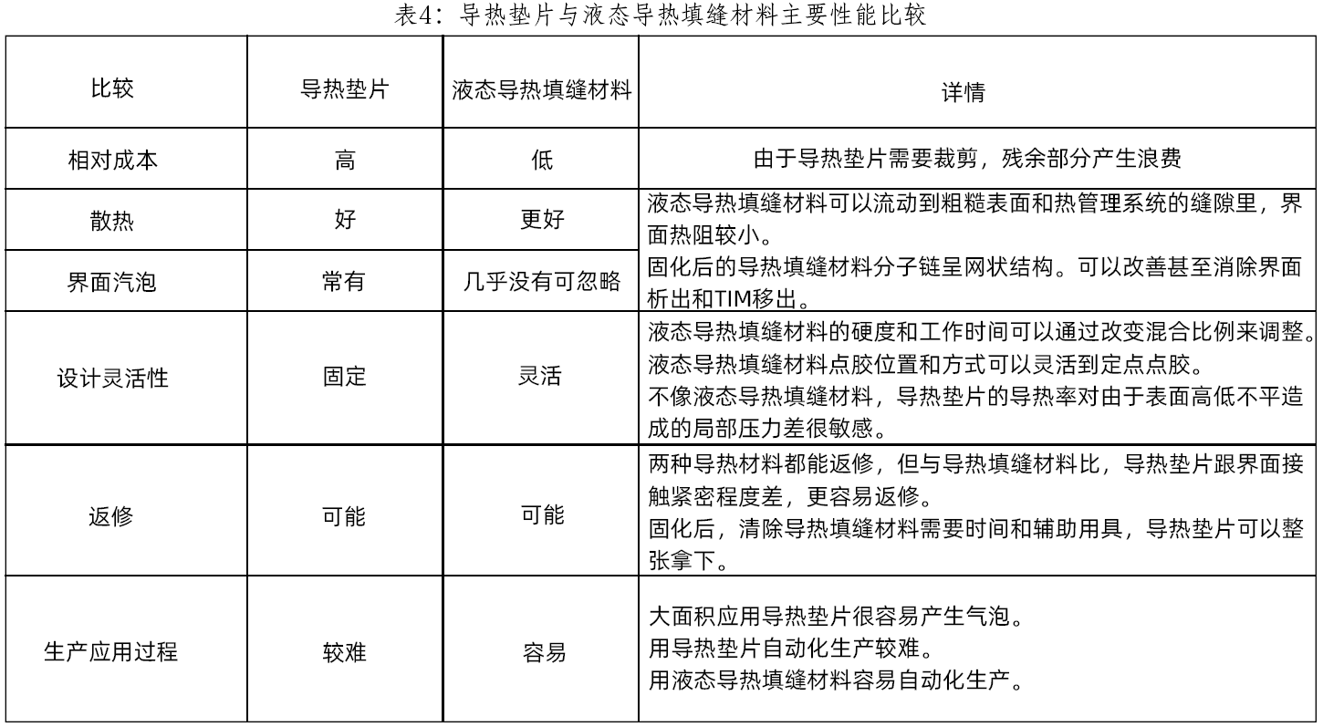 表4 詳細總結了導熱硅膠片和液態(tài)導熱填縫膠材料的優(yōu)缺點,除導熱效果不同外,生產(chǎn)流程也有區(qū)別。導熱墊片需要裁切到實際需要的形狀或尺寸,有殘余邊料部分無法使用造成浪費。導熱墊片需要手工操作,硬度做的太軟產(chǎn)品取出會變形。這些情況液態(tài)導熱填縫材料都可以避免,而且液態(tài)導熱填縫材料可以自動化使用。